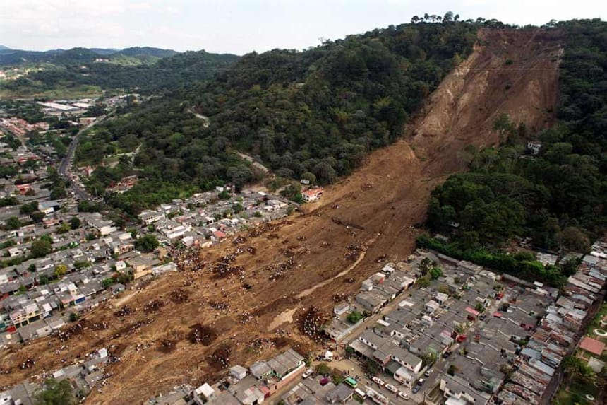 En la colonia Las Colinas, Santa Tecla, una parte de la montaña cedió y sepultó más de 300 viviendas bajo toneladas de tierra y rocas. Cientos de familias quedaron atrapadas en segundos. El deslave se convirtió en el símbolo del dolor nacional, al cobrarse la vida de unas 500 personas.