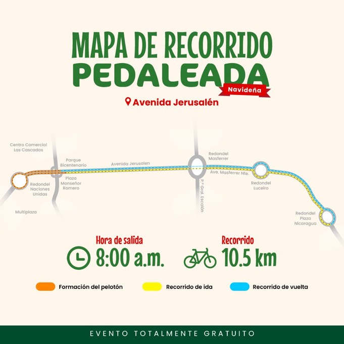 La Pedaleada Navideña tendrá un recorrido de 10.5 kilómetros y se incluirán actividades como juegos inflables para niños, clases de baile, taller de decoración de cupcakes, actividades como yoga, villancicos, rifa de bicicletas y cine al aire libre.