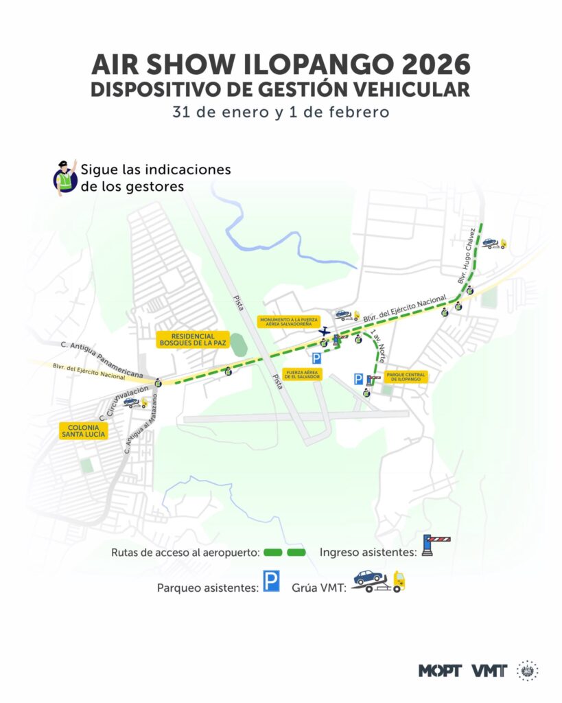 ElSalvador–El Viceministerio de Transporte (VMT) implementará un plan especial de tránsito durante el Ilopango Air Show 2026, que se realizará el sábado 31 de enero y el domingo 1 de febrero en el aeropuerto de Ilopango, San Salvador.
