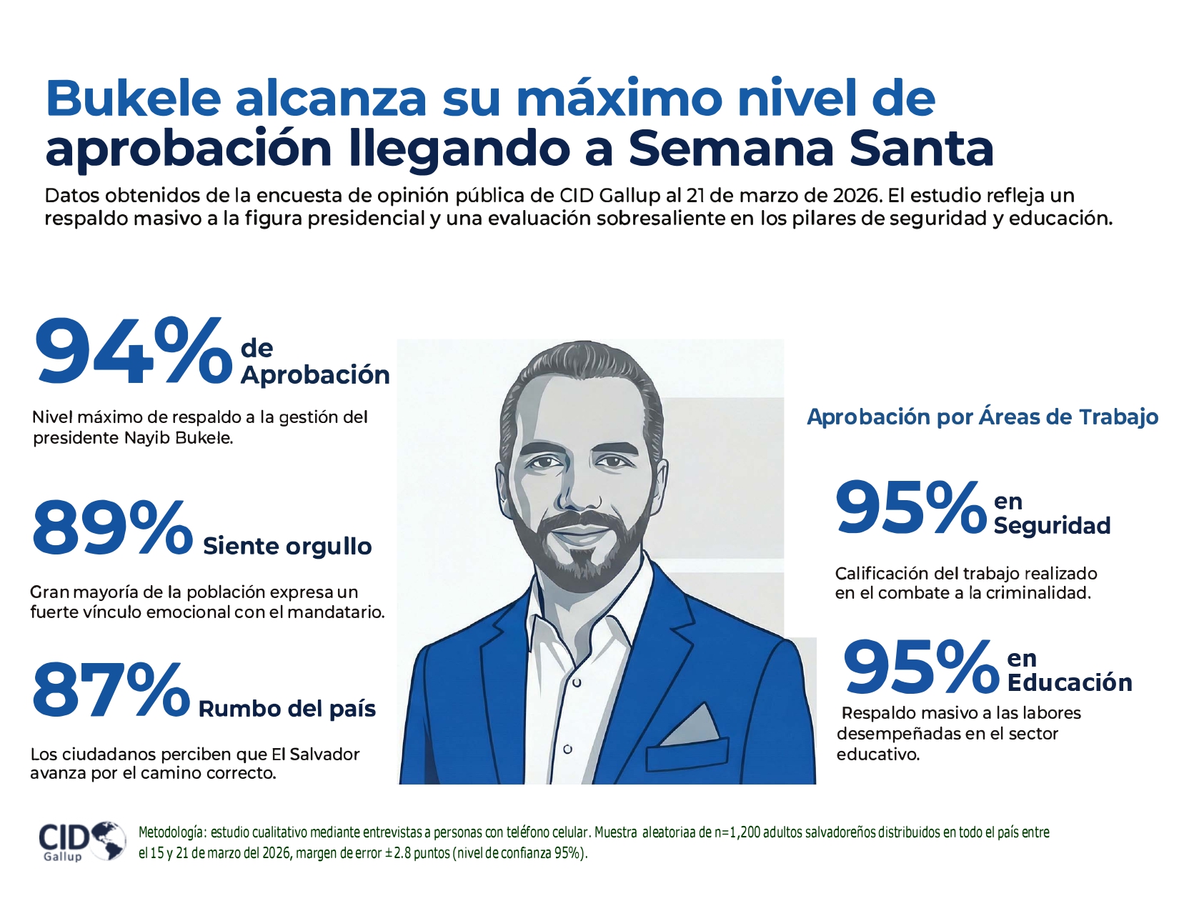 Además de la valoración general, el informe indica que el 87 % de los encuestados aprueba el rumbo del país, mientras que un 95 % respalda la gestión en educación. Asimismo, el 89 % afirmó sentir orgullo del mandatario. El documento no incluyó una evaluación específica sobre el régimen de excepción.