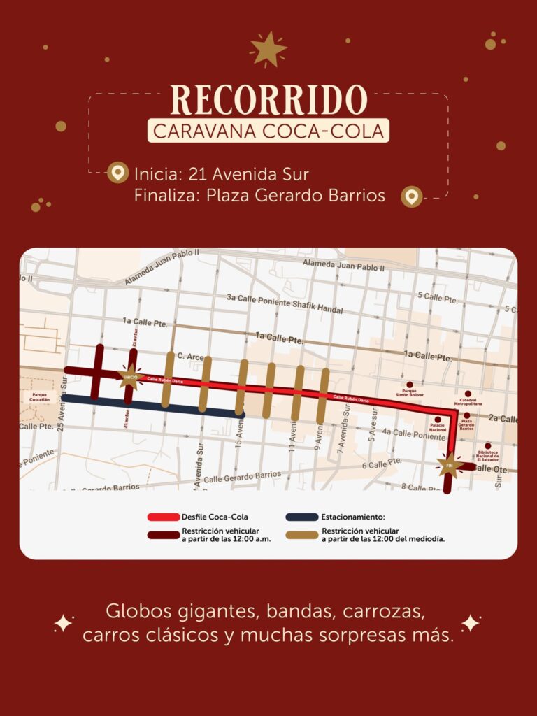 ElSalvador–El Viceministerio de Transporte (VMT) informó que varias calles del Centro Histórico de San Salvador estarán cerradas este domingo 21 de diciembre, debido a la realización de la tradicional caravana Coca-Cola de globos gigantes.