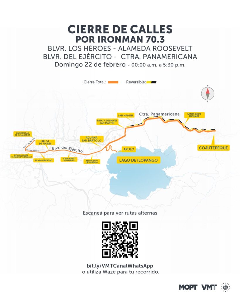 ElSalvador–La Alcaldía Municipal de San Salvador Este informó sobre el cierre temporal de calles en Apulo y zonas cercanas con motivo de la primera edición del Ironman 70.3 El Salvador, evento deportivo internacional que se desarrollará el domingo 22 de febrero.