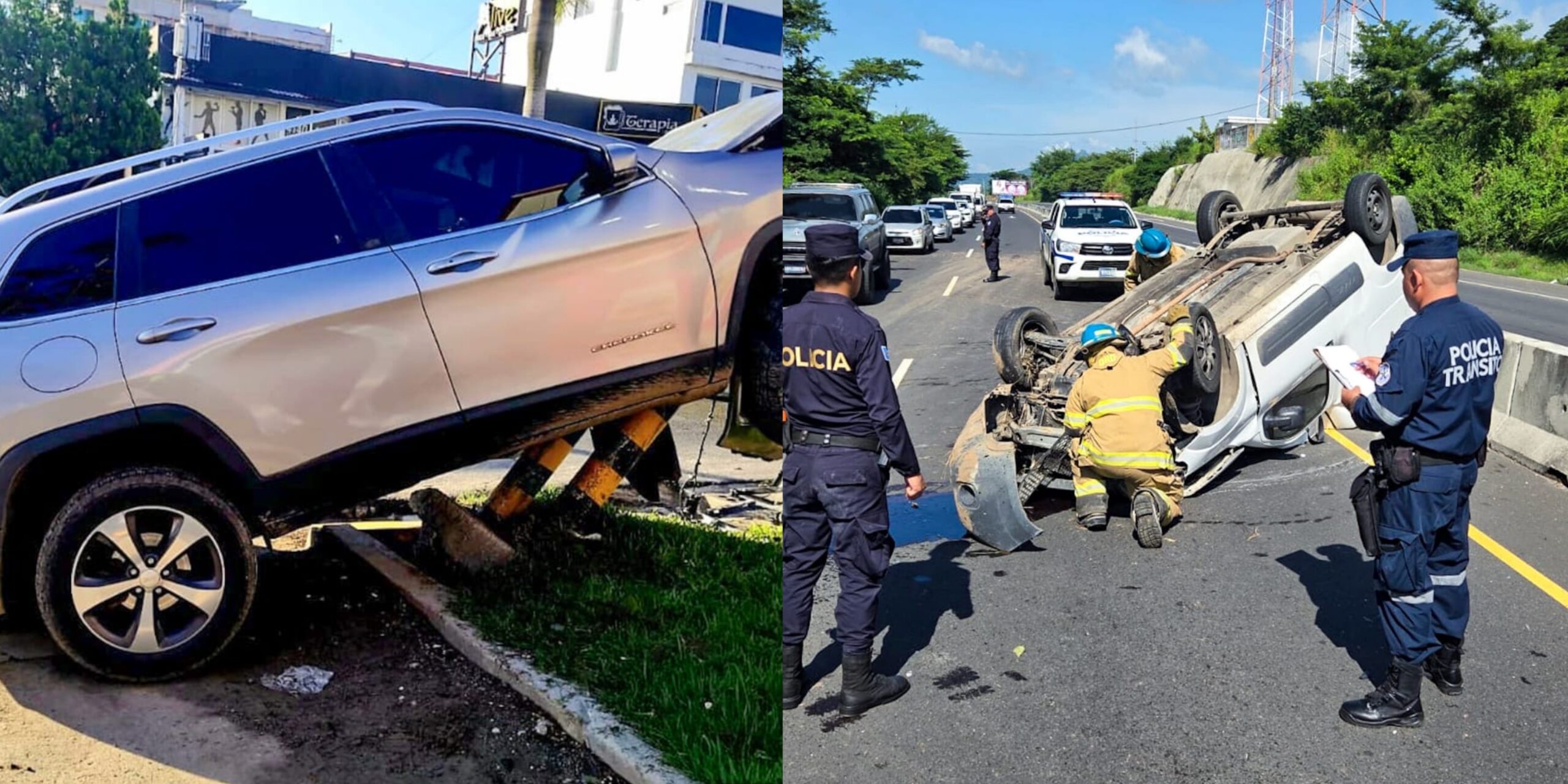 En otro accidente, un vehículo volcó en el kilómetro 56 de la carretera Litoral, cantón Concepción Jalponga, distrito Santiago Nonualco, La Paz, tras chocar contra los separadores. Dos personas resultaron lesionadas y fueron atendidas en el sitio. La PNC inspeccionó la zona, acordonó el área y gestionó la circulación vehicular.