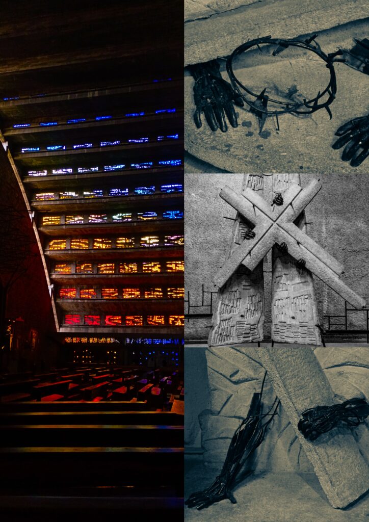 Los vitrales de colores que cubren el techo y los muros laterales transforman los rayos del sol en un juego de luces que inunda el interior con tonalidades vibrantes: azules, rojos, amarillos y verdes que cambian con el paso del día. Es un efecto que simboliza la presencia divina y la renovación constante de la fe.