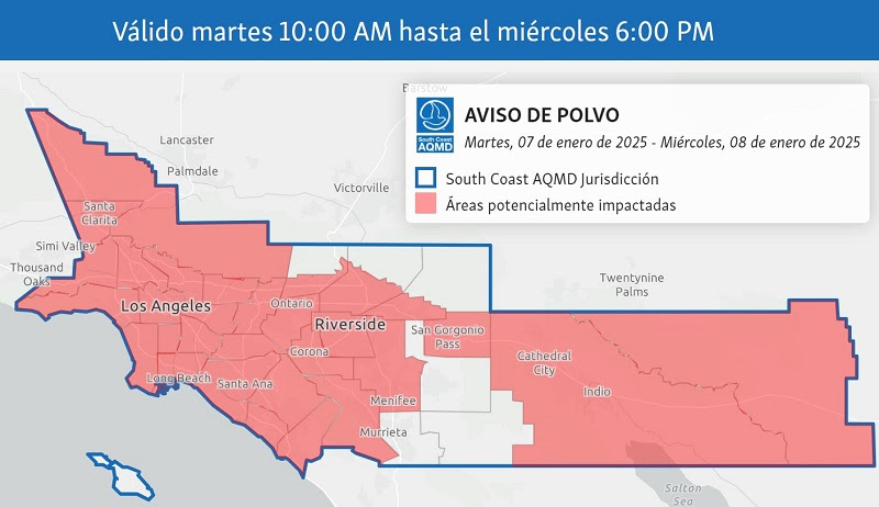 Martes durante el día | Se esperan altos niveles de PM10 cuando los fuertes vientos del noreste comiencen a afectar el área el martes por la mañana. Insalubres o peor AQI Es posible que se produzcan niveles elevados de PM10 en la mayoría de los condados de Los Ángeles, Orange y Riverside en la Cuenca Atmosférica de la Costa Sur y el Valle de Coachella. |