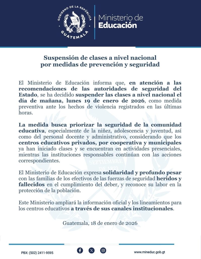 Guatemala– El Ministerio de Educación de Guatemala anunció la suspensión de las clases en todo el país para este lunes 19 de enero, como medida preventiva ante el incremento de hechos violentos registrados en las últimas horas, entre ellos ataques armados contra agentes de la Policía Nacional Civil (PNC).
