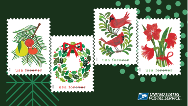 En la tercera estampilla, dos cardenales carmesí se posan en una rama de muérdago. Los cardenales norteños se han asociado desde hace mucho tiempo con las fiestas de invierno y adornan muchas tarjetas navideñas. Estos queridos pájaros cantores brindan gloriosos toques de color sobre las ramas nevadas de los árboles perennes en los jardines de todo el país.