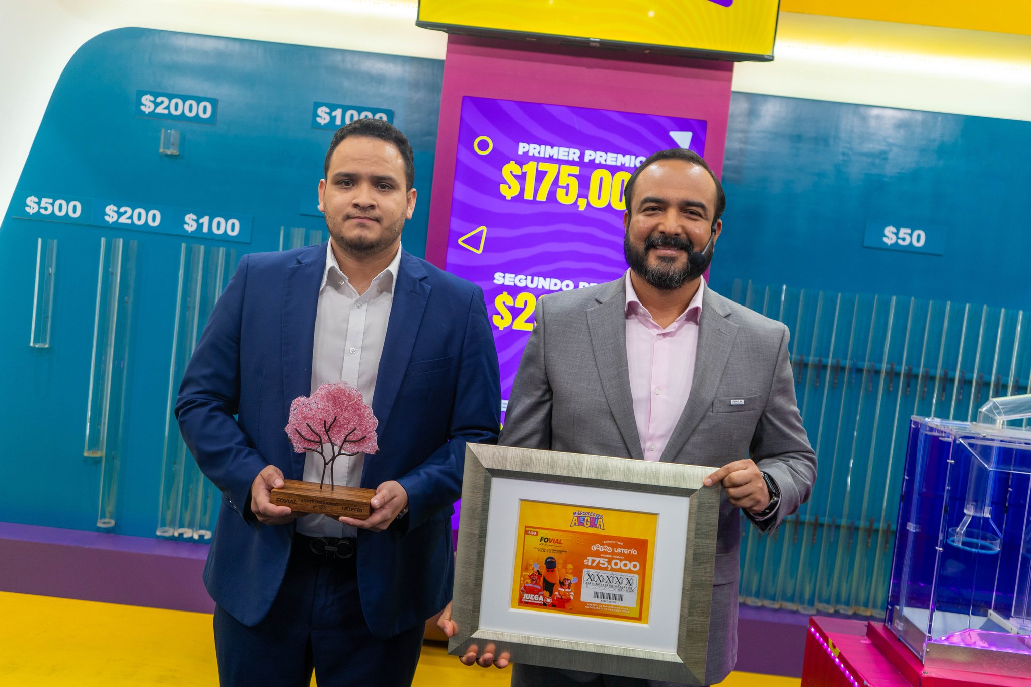 En el sorteo, el director ejecutivo de FOVIAL, Alexander Beltrán, participó en la introducción de balotas y selección de maletines. Al concluir el evento, el gerente comercial de LNB, Fernando López, entregó un cuadro conmemorativo a la institución.