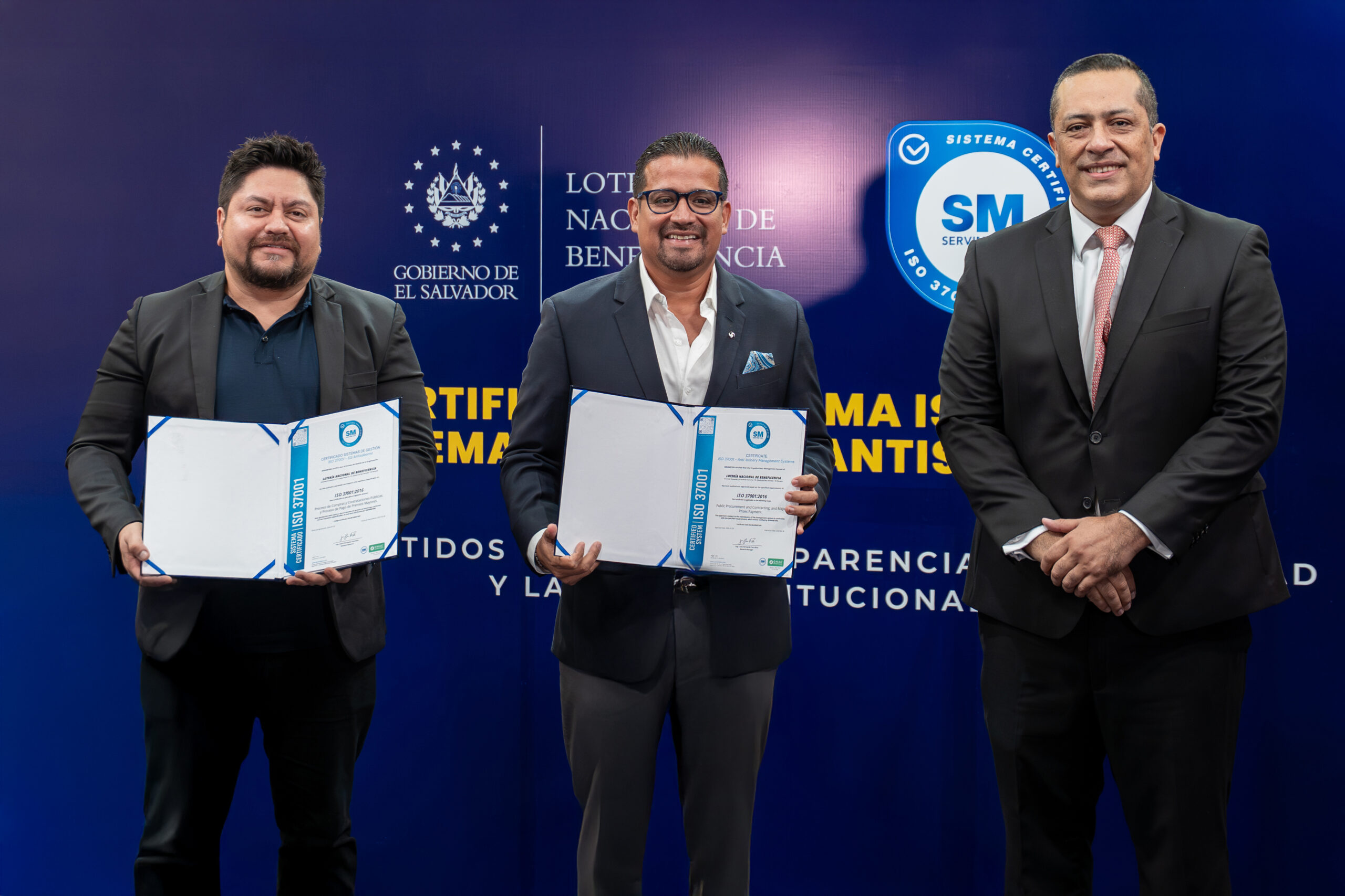 Anunciamos a la población salvadoreña y jugadores de juegos de azar que, tras superar las fases de auditoría, capacitación y adecuación de nuestros procesos de compras públicas y pago de premios, obtuvimos la certificación internacional ISO 37001 – 2016 Anti soborno, convirtiéndonos en la primera Lotería Estatal de Centroamérica y la segunda a nivel mundial en alcanzar este estándar.
