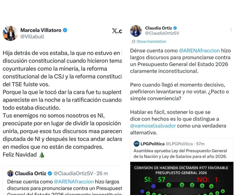 En respuesta, Marcela Villatoro rechazó las acusaciones y contraatacó desde sus redes sociales. “Tus enemigos no somos nosotros, es Nuevas Ideas. En vez de atacar a ARENA, deberías preocuparte por unir a la oposición”, escribió. También cuestionó la presencia y participación de Ortiz en discusiones clave, como las reformas constitucionales y el análisis del presupuesto en la Comisión de Hacienda.