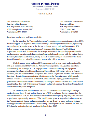 En la situación actual, el rescate propuesto por la Administración a la economía argentina probablemente apuntalará a un aliado político cercano de la Administración y proporcionará una importante ganancia inesperada a los fondos de cobertura y grandes inversores estadounidenses, mientras que los productores de soja estadounidenses que siguen perdiendo ventas a Argentina y las pequeñas empresas estadounidenses que buscan el pago de impagos anteriores no serán priorizados. De cara al futuro, le insto a colaborar estrechamente con el Congreso para abordar estos asuntos y a presentar un informe al Comité de Relaciones Exteriores del Senado que explique cómo esta ayuda: a) forma parte de una estrategia integral que promueve los intereses nacionales de Estados Unidos; b) establece condiciones claras para el reembolso; c) promueve reformas estructurales sostenibles en Argentina; y, lo más importante, d) incluye salvaguardas significativas para proteger a los contribuyentes estadounidenses.