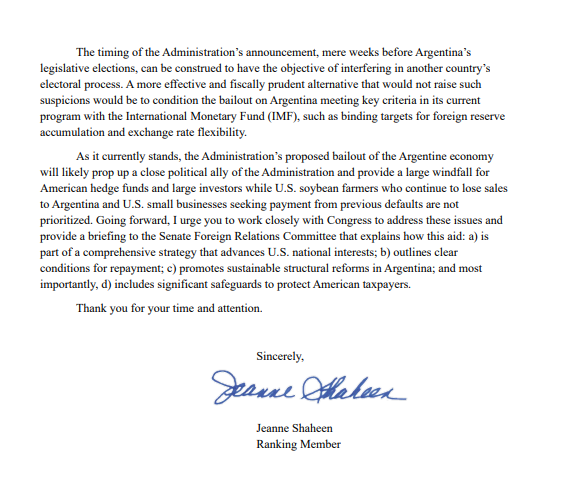 la senadora estadounidense Jeanne Shaheen (D-NH), miembro de mayor rango del Comité de Relaciones Exteriores del Senado , envió una carta al Secretario del Tesoro Scott Bessent y al Secretario de Estado Marco Rubio pidiendo respuestas sobre la decisión de la Administración Trump de proporcionar un rescate de 20 mil millones de dólares a Argentina.