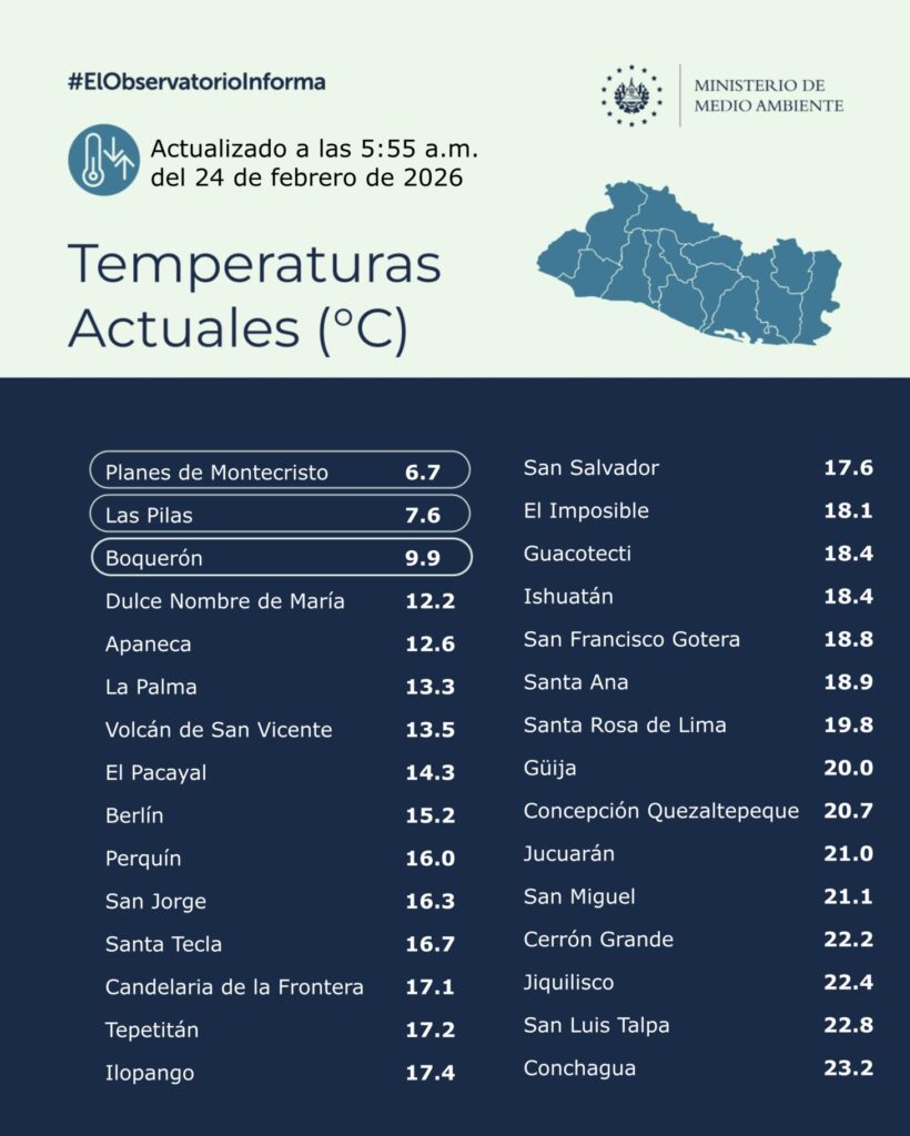 Durante la mañana del lunes se reportaron las temperaturas más bajas en Las Pilas (Chalatenango) con 11.2 °C; en la finca Los Andes (Santa Ana) y Planes de Montecristo con 11.4 °C; y en Los Naranjos (Sonsonate) con 14 °C.