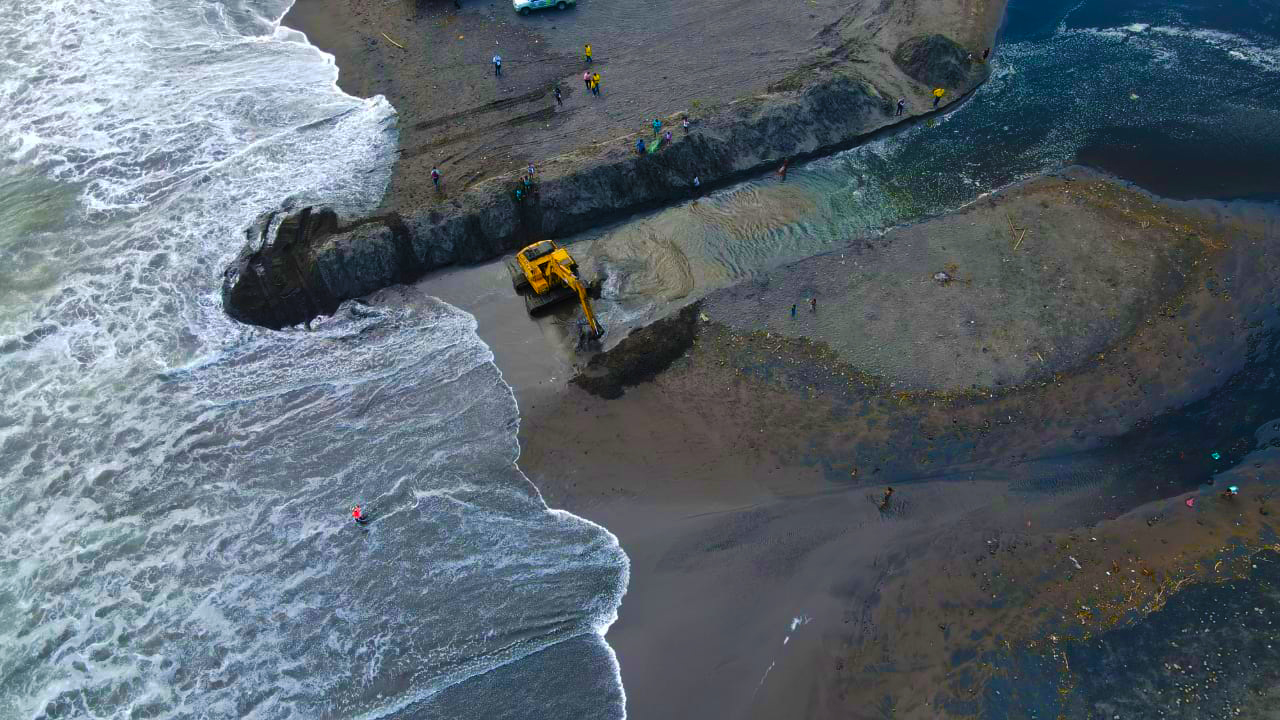 El Ministerio de Obras Públicas (MOP), realizó hoy una limpieza con maquinaria en la bocana de la playa El Majahual, en La Libertad, como parte del plan invernal 2021.