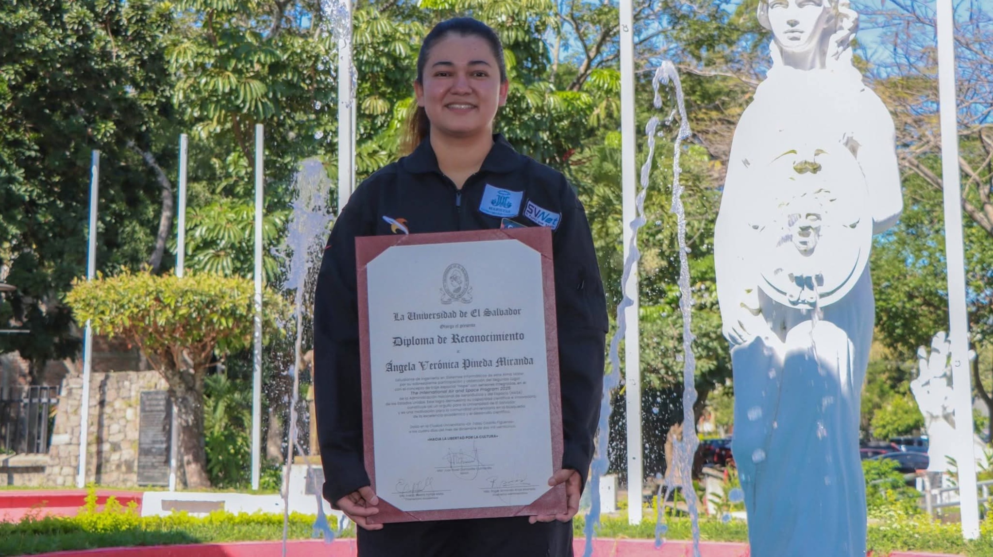 ElSalvador–Ángela Verónica Pineda Miranda, estudiante de tercer año de Ingeniería en Sistemas Informáticos de la Universidad de El Salvador (UES), recibió un reconocimiento institucional por su destacada participación en el International Air and Space Program 2025, organizado por la NASA, donde obtuvo el segundo lugar con su proyecto “Sistema autónomo de drones con micropropulsores”.