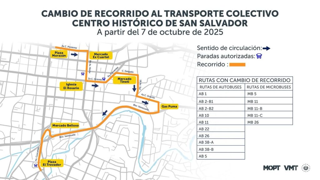 ElSalvador–El Viceministerio de Transporte (VMT), informó que a partir del 7 de octubre se implementarán nuevos recorridos para autobuses y microbuses que transitan de norte a sur por el Centro Histórico de San Salvador, con el objetivo de reorganizar la movilidad en esa zona.